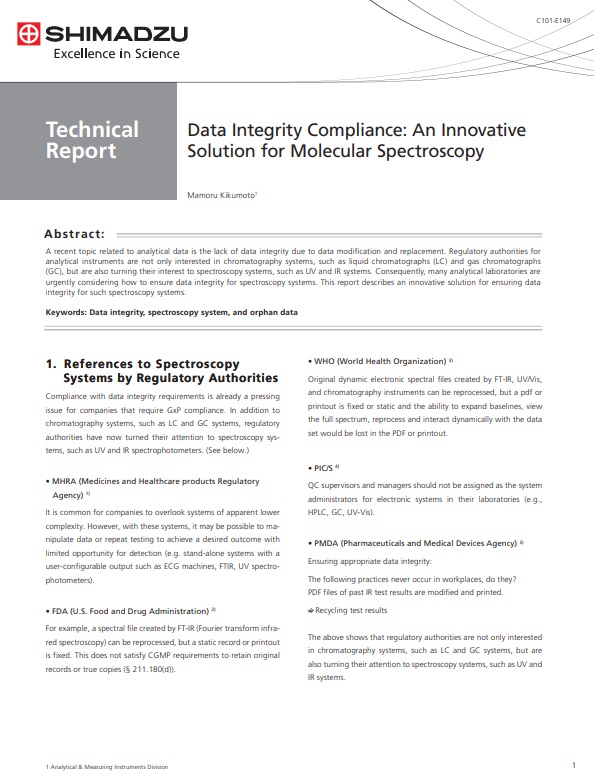 Analitik verilerle ilgili güncel konulardan biri, verilerin silinmesi ve değiştirilmesinden dolayı veri bütünlüğünün olmamasıdır. Analitik cihazların denetiminden sorumlu otoriteler yalnızca sıvı kromatografi (LC) ve gaz kromatografi (GC) gibi kromatografik sistemlerle ilgilenmekle kalmaz, aynı zamanda UV ve IR sistemleri gibi spektroskopi sistemlerine de ilgi duyarlar. Sonuç olarak, birçok analitik laboratuvar için spektroskopi sistemlerinde veri bütünlüğünün nasıl sağlanacağı konusu aciliyet kazanmıştır. Bu raporda, bu tür spektroskopi sistemleri için veri bütünlüğünün sağlanmasına yönelik yenilikçi bir çözüme yer verilmektedir.